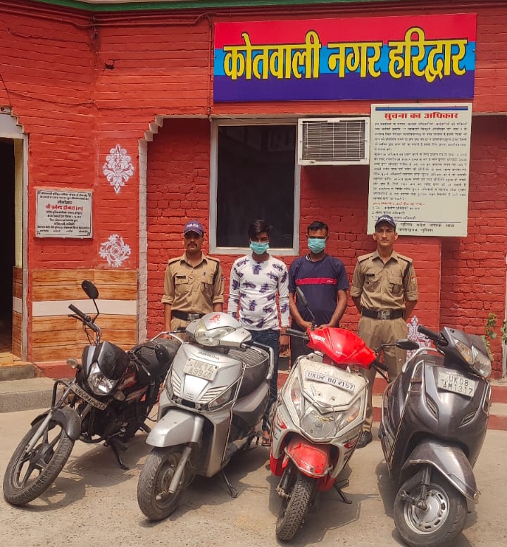 हरिद्वार, 8 मई। वाहन चोरी के मामले में नगर कोतवाली पुलिस ने दो आरोपियों को गिरफ्तार किया है। आरोपियों के कब्जे से 4 दोपहिया वाहन बरामद किए गए हैं। पुलिस के अनुसार बीती 3 मई को राजेश कुमार वर्मा निवासी तिवारी कालोनी रानीपुर ने उसकी मोटरसाईकिल चोरी कर लिए जाने के संबंध में मुकद्मा दर्ज कराया था। 6 मई को लाटोवाली कनखल निवासी महिला ने उसकी स्कूटी चोरी कर लिए जाने के संबंध में शिकायत दर्ज करायी थी।