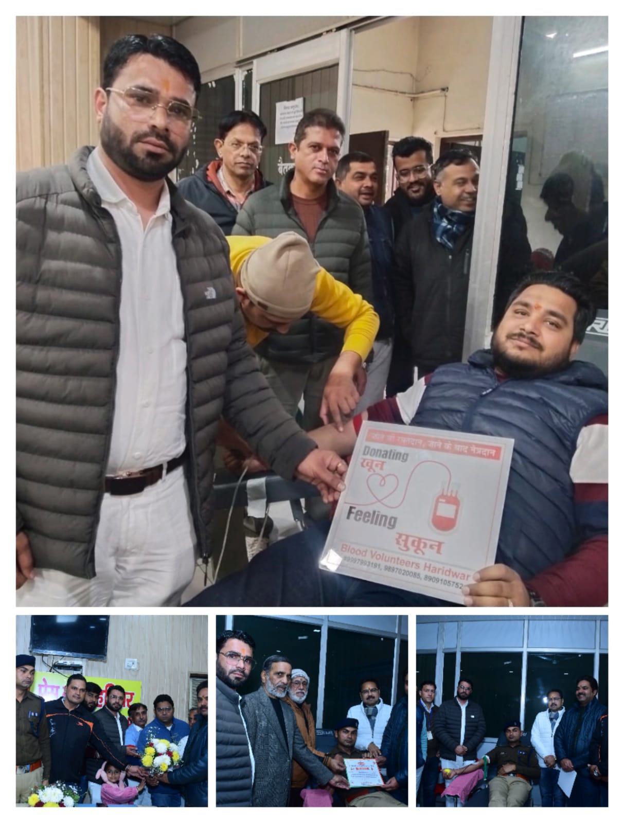हरिद्वार, 10 जनवरी। वरिष्ठ पत्रकार स्वर्गीय वेद प्रकाश चौहान की स्मृति में प्रैस क्लब एवं हरिद्वार की गूंज व ब्लड वालिंटियर्स के तत्वाधान में प्रैस क्लब सभागार में स्वैच्छिक रक्तदान शिविर का आयोजन किया गया। शिविर में 67 यूनिट रक्त एकत्र हुआ। रक्तदान शिविर का शुभारंभ अतिरिक्त पुलिस अधीक्षक विपिन कुमार, प्रैसक्लब अध्यक्ष अमित शर्मा, महामंत्री प्रदीप जोशी, समाजसेवी डा.विशाल गर्ग, वरिष्ठ पत्रकार रजनीकांत शुक्ला, रजत चौहान, संजय चौहान, ऋषभ चौहान आदि ने दीप प्रज्वलित कर किया। एसपी संचार विपिन कुमार ने भी रक्तदान किया और कहा कि रक्तदान महादान है।