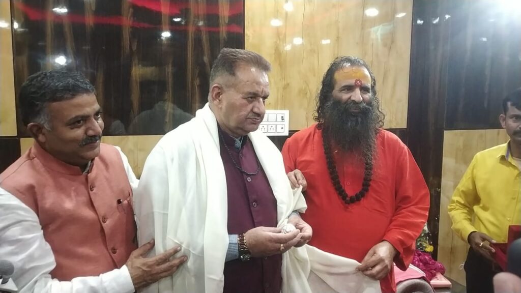 हरिद्वार। कैबिनेट मंत्री गणेश जोशी ने अखिल भारतीय अखाड़ा परिषद के अध्यक्ष एवं मनसा देवी मन्दिर ट्रस्ट के अध्यक्ष श्रीमहंत रविंद्रपुरी महाराज से शिष्टाचार भेंट कर आशीर्वाद लिया तथा अखाड़ा परिषद अध्यक्ष बनने पर शुभकामनाएं दी। कैबिनेट मंत्री गणेश जोशी के निरंजनी अखाड़ा पहुंचने पर श्रीमहंत रविंद्रपुरी ने शॉल ओढ़ाकर और शंख भेंट उनका स्वागत किया और आशीर्वाद प्रदान किया।