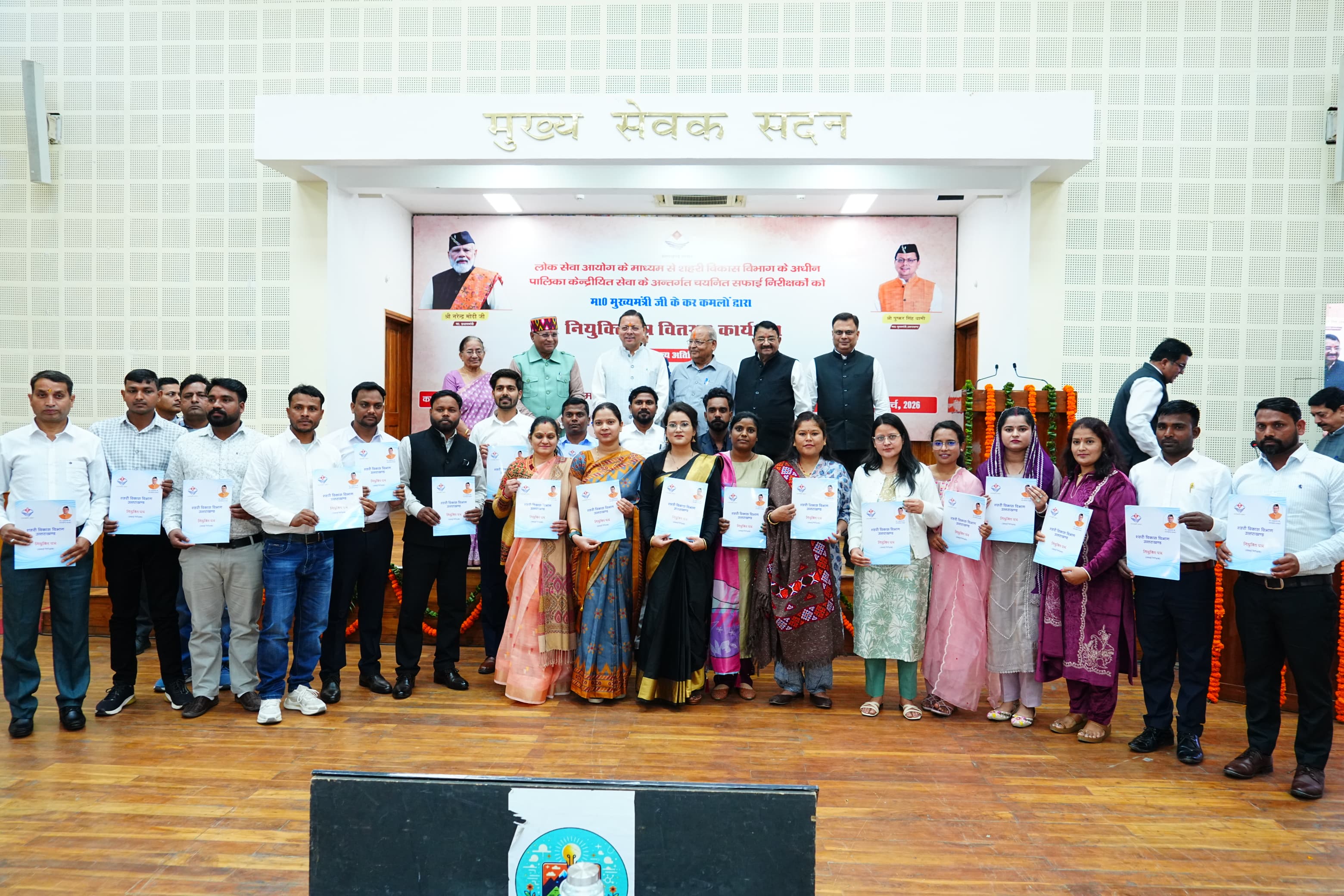 मुख्यमंत्री पुष्कर सिंह धामी ने सोमवार को मुख्यमंत्री कैम्प कार्यालय स्थित मुख्य सेवक सदन में शहरी विकास विभाग के अन्तर्गत चयनित 63 सफाई निरीक्षकों को नियुक्ति पत्र प्रदान किए। इस अवसर पर मुख्यमंत्री ने लगभग 62 करोड़ की अनुमानित लागत से बनने वाले शहरी विकास निदेशालय के नवीन भवन का वर्चुअल शिलान्यास भी किया। मुख्यमंत्री ने कार्यक्रम के दौरान कूड़ा निस्तारण वाहनों को हरी झंडी दिखाकर रवाना भी किया। मुख्यमंत्री ने कहा कि चार वर्षों में राज्य में लगभग 30 हजार युवाओं को सरकारी नौकरी प्रदान की जा चुकी है।