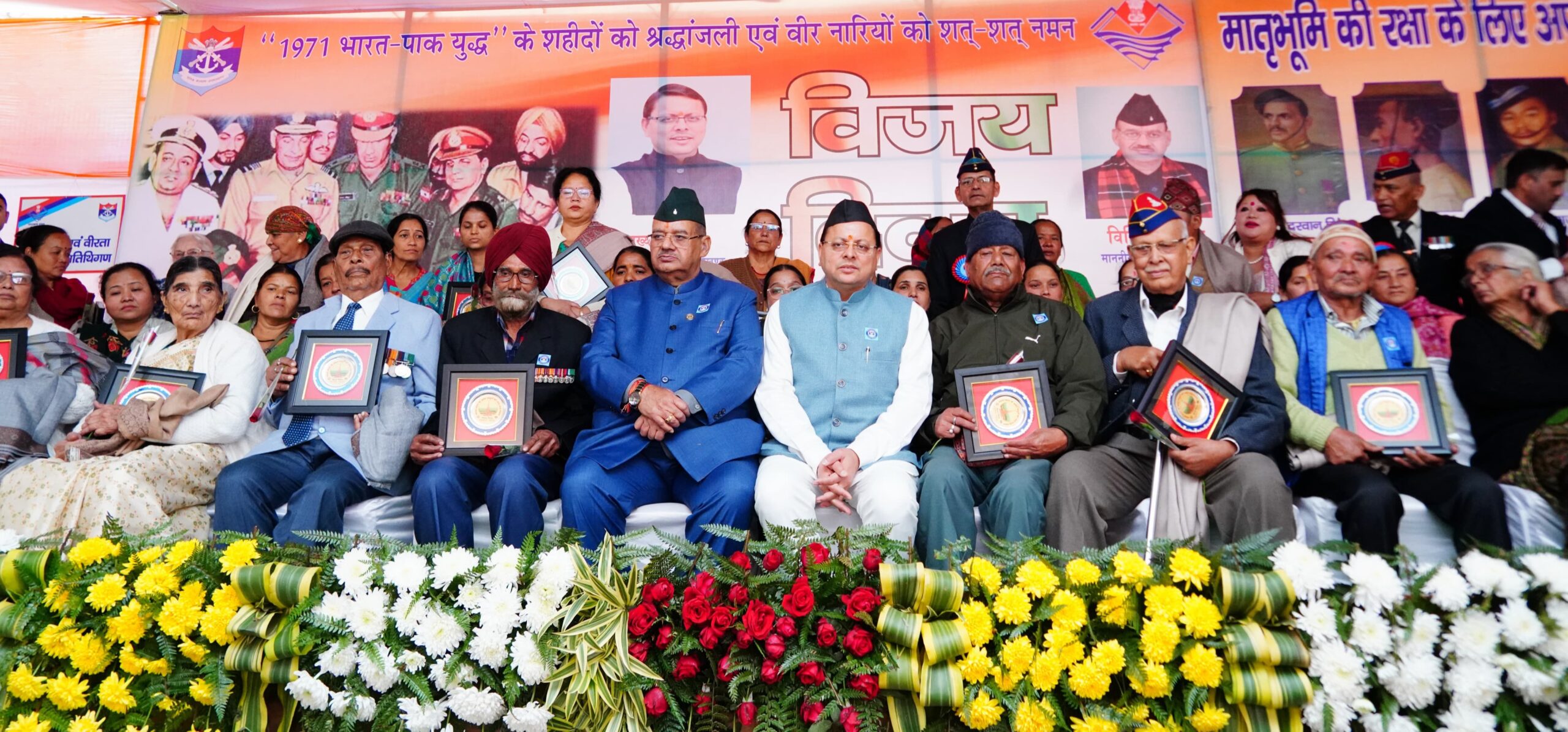 सोमवार को गांधी पार्क में आयोजित विजय दिवस समारोह में अपने संबोधन की शुरुआत मुख्यमंत्री पुष्कर सिंह धामी ने 1971 के य़ुद्ध में शहीद हुए सैनिकों को श्रद्धांजलि अर्पित करने के साथ की। इसके बाद मुख्यमंत्री पुष्कर सिंह धामी ने कहा कि भारतीय सैनिकों ने 1971 के युद्ध में न केवल राष्ट्र की अखंडता और स्वाभिमान की रक्षा की बल्कि अपने अद्वितीय रण कौशल द्वारा दुश्मन को चारों खाने चित्त भी कर दिया। मुख्यमंत्री ने कहा कि 1971 में पाकिस्तान के साथ लड़ा गया यह युद्ध स्वतंत्र भारत के इतिहास का एक ऐसा स्वर्णिम अध्याय है, जो प्रत्येक भारतीय के लिए गौरव और प्रेरणा का स्रोत है। 1971 के युद्ध में हमारी सेना ने विश्व को दिखा दिया कि भारत न केवल अपनी संप्रभुता की रक्षा करने में सक्षम है, बल्कि जरूरत पड़ने पर मानवता और न्याय की रक्षा के लिए भी खड़ा हो सकता है। इस युद्ध में हमारी तीनों सेनाओं ने मात्र 13 दिनों में पाकिस्तान को घुटने टेकने पर मजबूर कर दिया था।