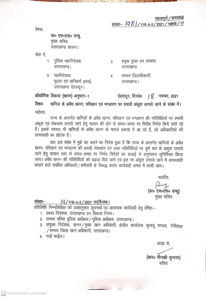 मुख्य सचिव द्वारा इस सम्बन्ध में पुलिस महानिदेशक, महानिदेशक भूतत्व एवं खनिकर्म इकाई, प्रमुख मुख्य वन संरक्षक एवं समस्त जिलाधिकारियों को आदेश जारी किए गए हैं।
