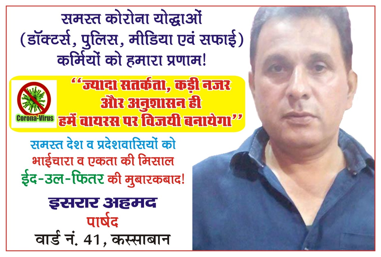 आज पूरा देश एकजुट होकर कोरोना के खिलाफ जंग लड़ रहा है। इसरार अहमद ने कहा कि केंद्र व राज्य सरकार को राजनीतिक भेदभाव से ऊपर उठकर समाज के प्रत्येक तबके की मदद करनी चाहिए। सरकारों को लोगों को बिजली व पानी के बिल तथा स्कूल फीस माफ कर राहत देनी चाहिए। कामधंधा बंद होने से लोग हताशा व निराशा के माहौल में हैं। उन्होंने कहा कि गरीब, असहाय, निर्धन परिवारों को लगातार खा़द्य सामग्री भी प्रदान की जा रही है। कोरोना के प्रति लोगों को जागरूक करने का काम भी किया जा रहा है। कोरोना योद्धाओं का सम्मान सभी को करना चाहिए।