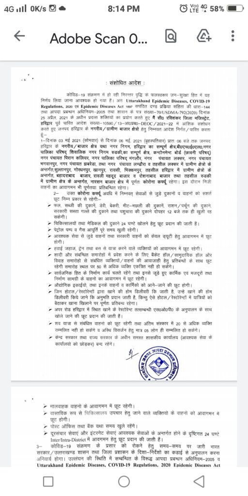 हरिद्वार :-करोना संक्रमण की रफ्तार को कम करने के लिए राज्य में 6 मई तक कोविड-19 कर्फ्यू को बढ़ाया गया। कर्फ्यू के दौरान जनपद में आवश्यक वस्तुओं की बिक्री अब 12:00 बजे तक ही हो सकेगी। निजी वाहनों की आवाजाही पर पूर्व की भाति रोक रहेगी। जिलाधिकारी सी रवि शंकर के आदेशों के चलते शहरी एवं ग्रामीण क्षेत्रों में कॉविड कर्फ्यू के नियमों का पालन करने के आदेश दिए गए हैं ।3 दिन बढ़ाए गए कोविड-19 कर्फ्यू के दौरान फल सब्जी ,डेरी, बेकरी मीट मछली की दुकानें राशन, परचून की दुकान ,सस्ते गल्ले की दुकान एवं पशु चारा दुकाने दोपहर 12:00 बजे तक ही खुली रहेंगी। आवश्यक सेवा से जुड़े वाहनों को एवं सरकारी वाहनों को केवल ड्यूटी हेतु आवागमन की छूट प्रदान की गई है।
