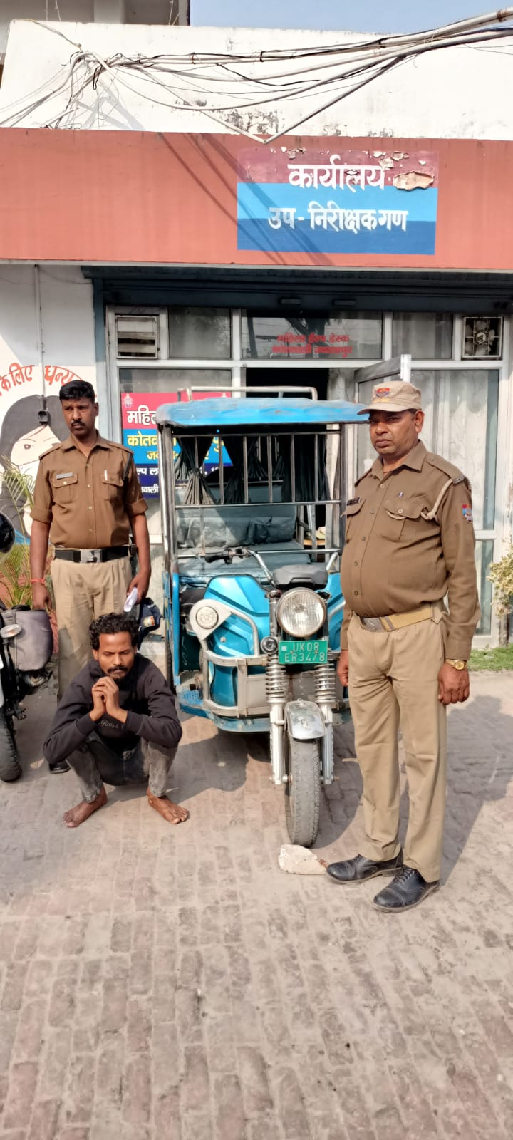 हरिद्वार, 6 नवम्बर। ज्वालापुर कोतवाली पुलिस ने एक व्यक्ति को चोरी की ई रिक्शा सहित गिरफ्तार किया है। कोतवाली प्रभारी आरके सकलानी ने बताया कि मनोज कुमार निवासी बारहकोठी कनखल ने हरिलोक तिराहे के पास से उसकी ई रिक्शा चोरी कर लिए जाने के संबंध में मुकद्मा दर्ज कराया था।