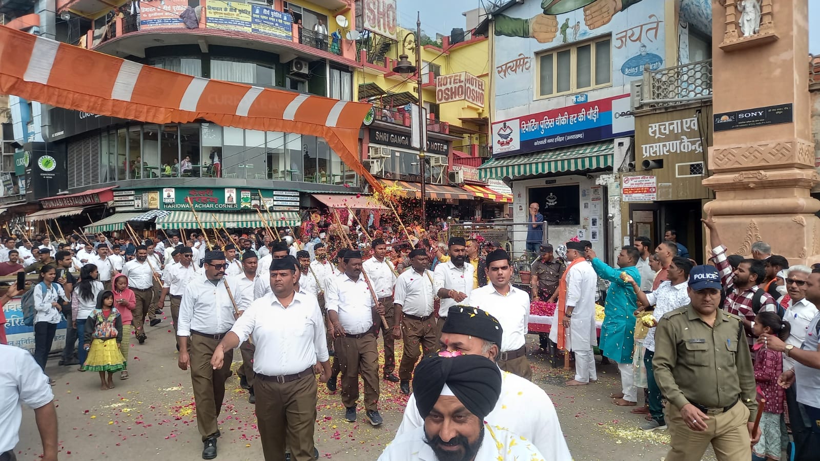 हरिद्वार, 19 मार्च। राष्ट्रीय स्वयंसेवक संघ द्वारा चैत्र शुक्ल प्रतिपदा विक्रम सम्वत्सर 2080 नववर्ष के उपलक्ष्य में नगर में पथ संचलन किया गया। पथ संचलन वेदा ग्रीन निर्मला छावनी से शुरू होकर ब्रह्मपुरी, गुरुद्वारा रोड, लालतरौ पुल, पोस्ट ऑफिस, अपर रोड होते हुए हर की पौड़ी से वापस बड़ा बाजार, गऊ घाट, मोती बाजार, सब्जी मंडी, राम घाट, विष्णु घाट होकर भल्ला रोड़ से पुनः पोस्ट ऑफिस से निर्मला छावनी पहुँचकर कर सम्पन्न हुआ। पथ संचलन पर भारत माता के जयघोष के साथ जगह-जगह फूलों की वर्षा की गई। इससे पूर्व संघ स्थान निर्मला छावनी में आद्य सर संघ संचालक प्रणाम किया गया। जिसके बाद मुख्य वक्ता पश्चिमी क्षेत्र प्रचार प्रमुख पदम का बौद्धिक हुआ।