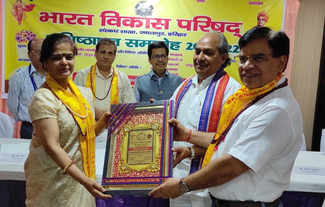 हरिद्वार, 10 सितंबर। भारत विकास परिषद संस्कार द्वारा समारोह का आयोजन कर शिक्षा क्षेत्र में उत्कृष्ट योगदान के लिए शिक्षकों को सम्मानित किया गया। समारोह में मुख्य अतिथी गुरुकुल विश्वविद्यालय के कुलपति डा.रूपकिशोर शास्त्री एवं मुख्य शिक्षा अधिकारी डा.आनन्द भारद्वाज ने विद्या विहार एकेडमी की प्रिंसीपल शोभना पालीवाल एवं दिव्या भारद्वाज को उनके उत्कृष्ट योगदान के लिए शिक्षा सृजन रत्न पुरस्कार प्रदान किया। कार्यक्रम में चिकित्सक डा.एन के अग्रवाल एवं डा.नितिन वर्मा को भी सम्मानित किया गया।