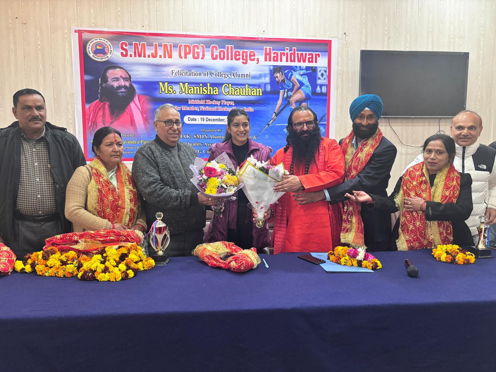 हरिद्वार, 19 दिसम्बर। भारतीय महिला हॉकी टीम की सदस्य एवं एसएमजेएन कालेज की पूर्व छात्रा मनीषा चौहान का अखाड़ा परिषद एवं कालेज प्रबंध समिति के अध्यक्ष श्रीमहंत रविंद्रपुरी महाराज, प्राचार्य प्रो.सुनील कुमार बत्रा व प्राध्यापकों, स्टाफ व कालेज के छात्र-छात्राओं ने कालेज में भव्य स्वागत किया। श्रीमहंत रविन्द्रपुरी महाराज ने मनीषा चौहान को आशीर्वाद देते हुए कहा कि मनीषा चौहान की लगन और परिश्रम ने हरिद्वार का नाम सम्पूर्ण विश्व में रोशन किया हैं। उन्होंने कहा कि अनुशासन, संयमित व्यवहार और परिश्रम की निरंतरता ने ही मनीषा चौहान को यूथ आइकॉन बनाया हैं।