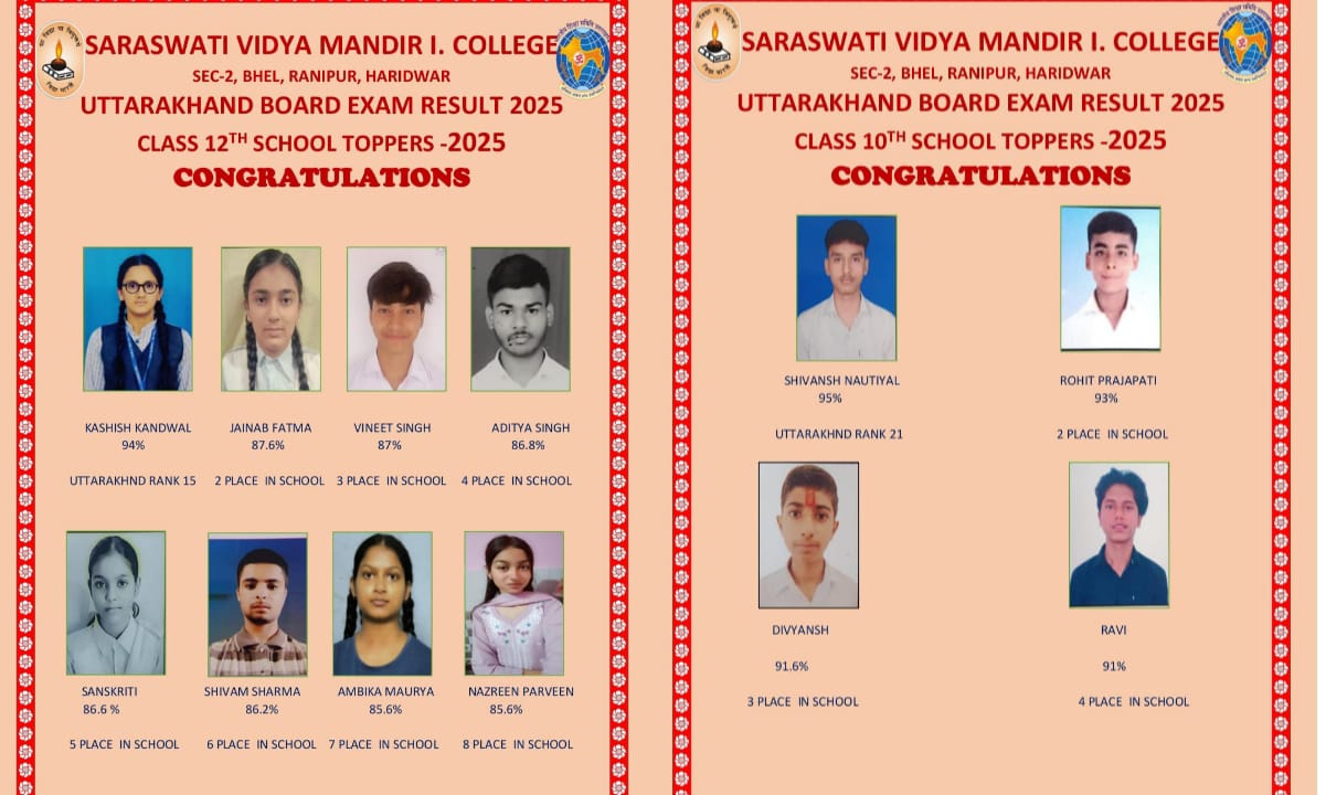 हरिद्वार, 19 अप्रैल। उत्तराखंड विद्यालय शिक्षा परिषद ने स्कूल और इंटरमीडिएट का परीक्षा परिणाम जारी किया। सरस्वती विद्या मंदिर इंटर कॉलेज सेक्टर 2 रानीपुर भेल हरिद्वार में विगत वर्षों की भांति इस वर्ष भी विद्यालय के छात्रों ने वरीयता सूची में स्थान प्राप्त किया। जिसमें इंटरमीडिएट में कशिश कांडपाल में 94 प्रतिशत अंक प्राप्त करके प्रदेश में 15वां स्थान प्राप्त किया। हाई स्कूल में शिवांश नौटियाल 95 प्रतिशत अंक प्राप्त करके प्रदेश की वरीयता सूची में 21वां स्थान प्राप्त किया।