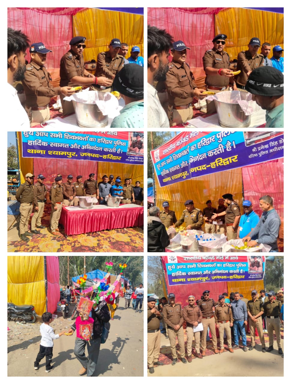 हरिद्वार:-श्यामपुर थानाध्यक्ष नितेश शर्मा ने एसपीओ और अन्य पुलिस कर्मियों के साथ कांवड़ियों को फल व पानी की बोतलें का वितरण कर कांवड़ियों की सेवा की। जय भोले के जयकारों के बीच रसियाबड़ में प्रवेश करने वाले शिवभक्तों का पुलिस ने हरिद्वार-नजीबाबाद हाईवें किनारे अभिनंदन किया।