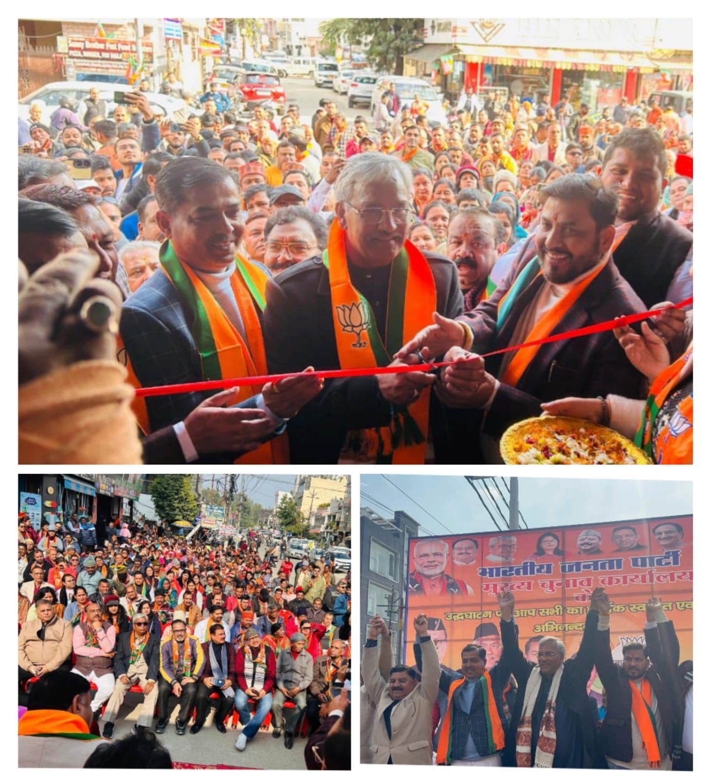 हरिद्वार, 6 जनवरी। नगर पालिका शिवालिक नगर से अध्यक्ष पद के भाजपा प्रत्याशी राजीव शर्मा के शिवालिक नगर स्थित मुख्य चुनाव कार्यालय का उद्घाटन सांसद एवं पूर्व मुखमंत्री त्रिवेन्द्र सिंह रावत ने किया। इस अवसर पर जनसभा को सम्बोधित करते हुए सांसद व पूर्व मुख्यमंत्री त्रिवेन्द्र सिंह रावत ने कहा कि राजीव शर्मा व सभी सभासदों की जीत सुनिश्चित है और कार्यकर्ता अब नगर पालिका अध्यक्ष जीत का उत्तराखण्ड में एक बड़ा रिकॉर्ड बनाने के लिए कार्य कर रहे है। उन्होंने कहा कि कोरोना काल में राजीव शर्मा ने अपनी जान को जोखिम में डाल कर जनता की सेवा की है और ख़ुद को यहां के लिए खपाया है।