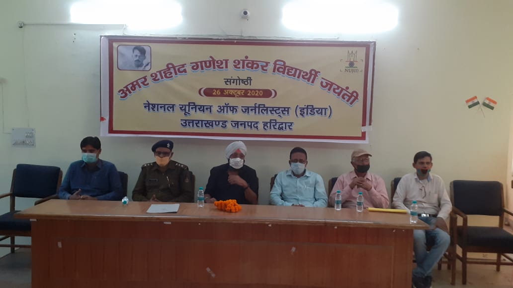हरिद्वार । स्वतंत्रता संग्राम सेनानी एवं पत्रकारिता के आदर्श महापुरूष अमर शहीद गणेश शंकर विद्यार्थी की जयन्ती पर नेशनल यूनियन ऑफ जर्नलिस्ट्स (इण्डिया) की ओर से प्रेस क्लब में संगोष्ठी का आयोजन किया गया। कार्यक्रम में मुख्य अतिथि अपर मेलाधिढंकारी सरदार हरवीर सिंह ने कहा कि पत्रकार और पत्रकारिता समाज का दर्पण हैं।