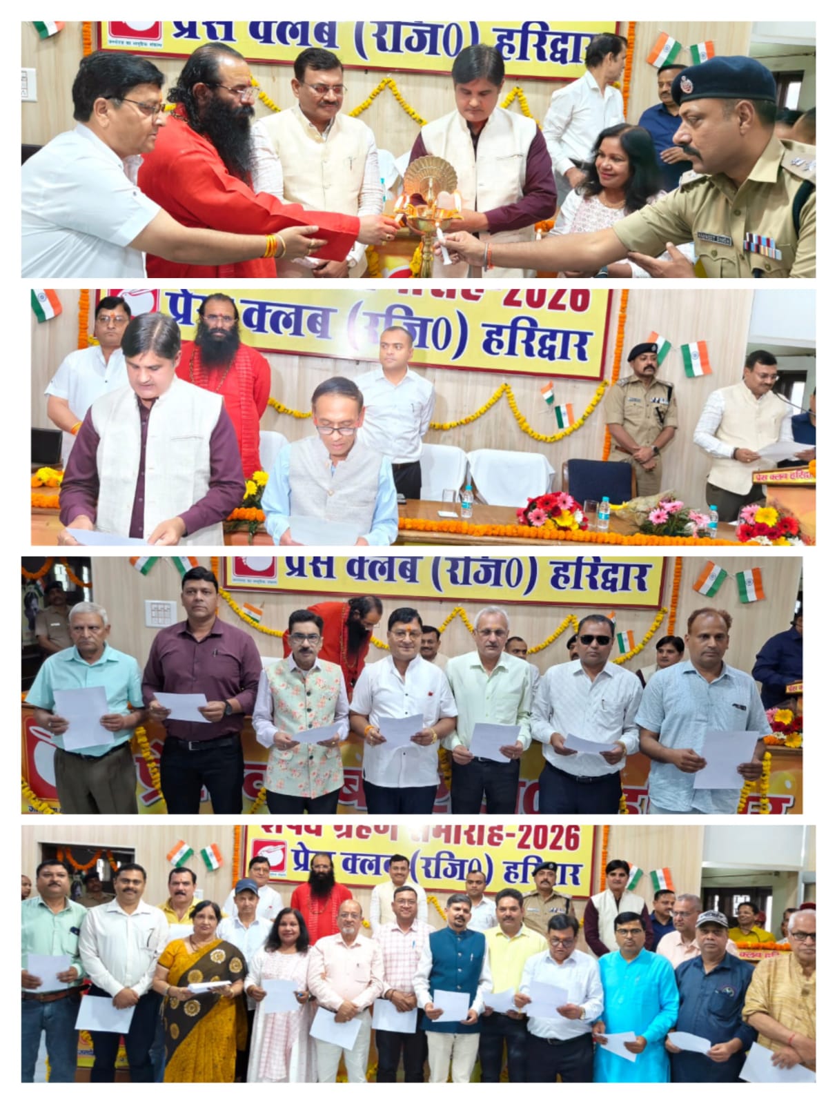 शपथ ग्रहण समारोह का शुभारंभ मुख्य सचिव आनंद वर्द्धन, अखाड़ा परिषद अध्यक्ष श्रीमहंत रविंद्रपुरी, जिलाधिकारी मयूर दीक्षित, एसएसपी नवनीत सिंह भुल्लर, नवनिर्वाचित प्रेस क्लब अध्यक्ष धर्मेंद्र चौधरी, महामंत्री सूर्यकांत बेलवाल, पूर्व महामंत्री दीपक मिश्रा ने संयुक्त रूप से दीप प्रज्वलित कर किया।
