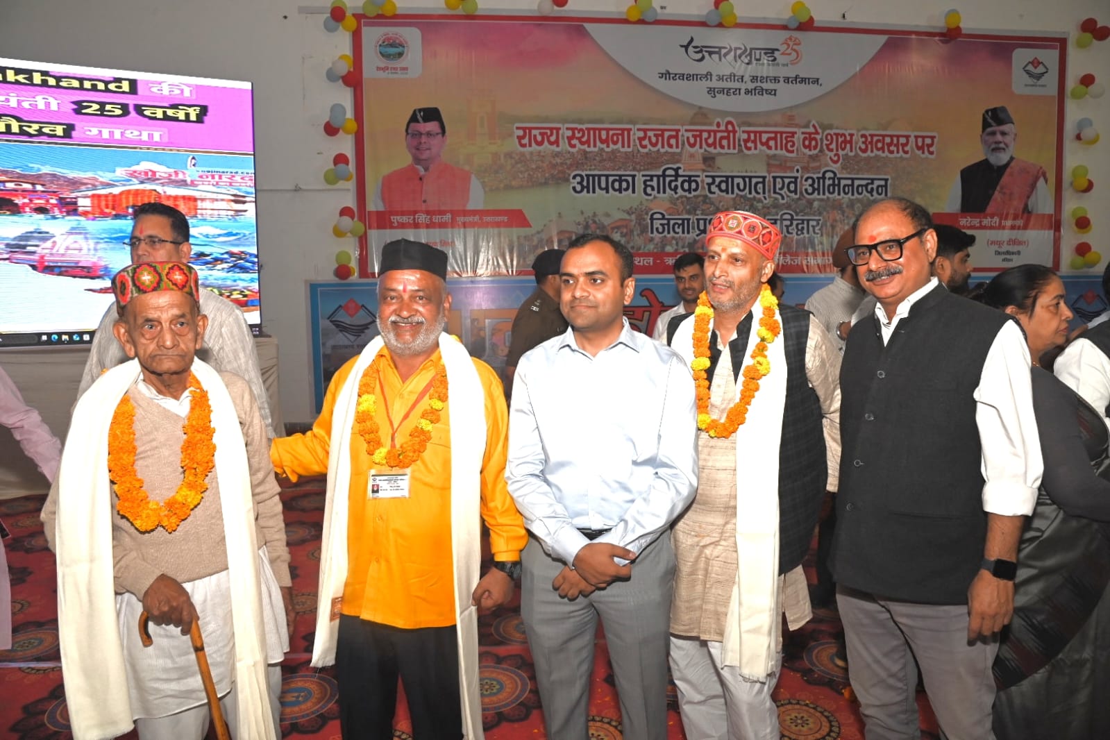 हरिद्वार, 8 नवम्बर। उत्तराखंड राज्य के स्थापना रजत जयंती सप्ताह के अंतर्गत आयोजित कार्यक्रमों में आज ऋषिकुल आयुर्वेदिक महाविधालय ऑडोटोरियम में जिला प्रशासन की ओर से जनपद के राज्य आंदोलनकारियों के लिए सम्मान समारोह आयोजित किया गया।जिसमें मुख्य अतिथि राज्य सभा सासंद कल्पना सैनी एवं अन्य जनप्रतिनिधियों द्वारा दीप प्रज्वलित कर कार्यक्रम का शुभारंभ किया।इस अवसर पर राज्य आंदोलनकारियों को पुष्प माला एवं शॉल भेंटकर सम्मानित किया।