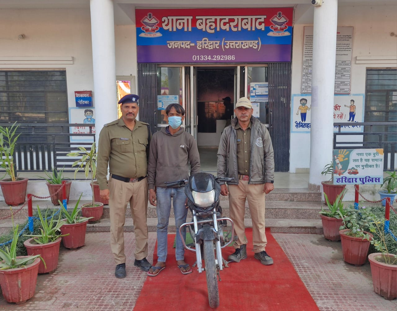 हरिद्वार, 22 नवम्बर। नहर पटरी पर हुई बाइक लूट का खुलासा करते हुए थाना बहादराबाद पुलिस ने एक आरोपी को गिरफ्तार कर लूटी गयी बाइक बरामद की है। घटना में शामिल अन्य 3 आरोपियों की पुलिस तलाश कर रही है। 29 अगस्त की रात नहर पटरी पर कुछ बदमाश इक्कड़ खुर्द थाना पथरी निवासी कुर्बान पुत्र शमशाद की बाइक लूटकर फरार हो गए थे। घटना के अगले दिन कुर्बान ने पुलिस को तहरीर देकर 3-4 अज्ञात बदमाशों के खिलाफ मुकद्मा दर्ज कराया था।