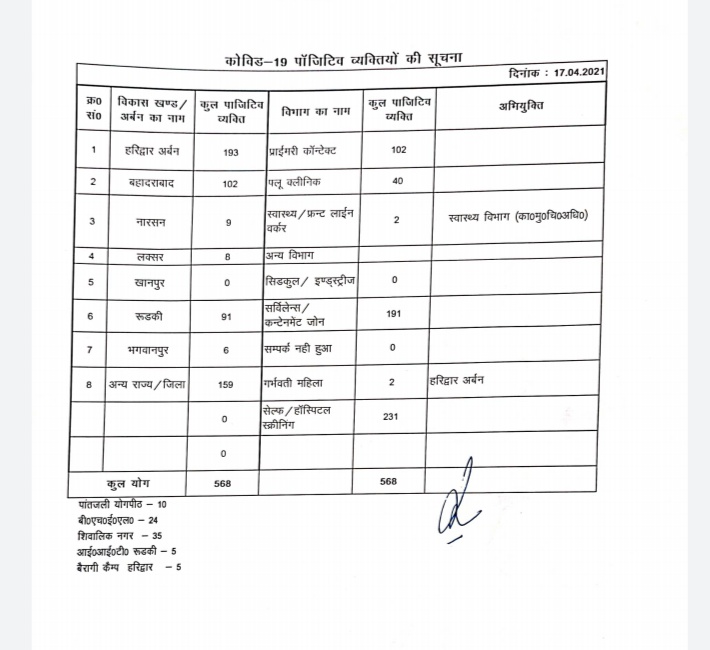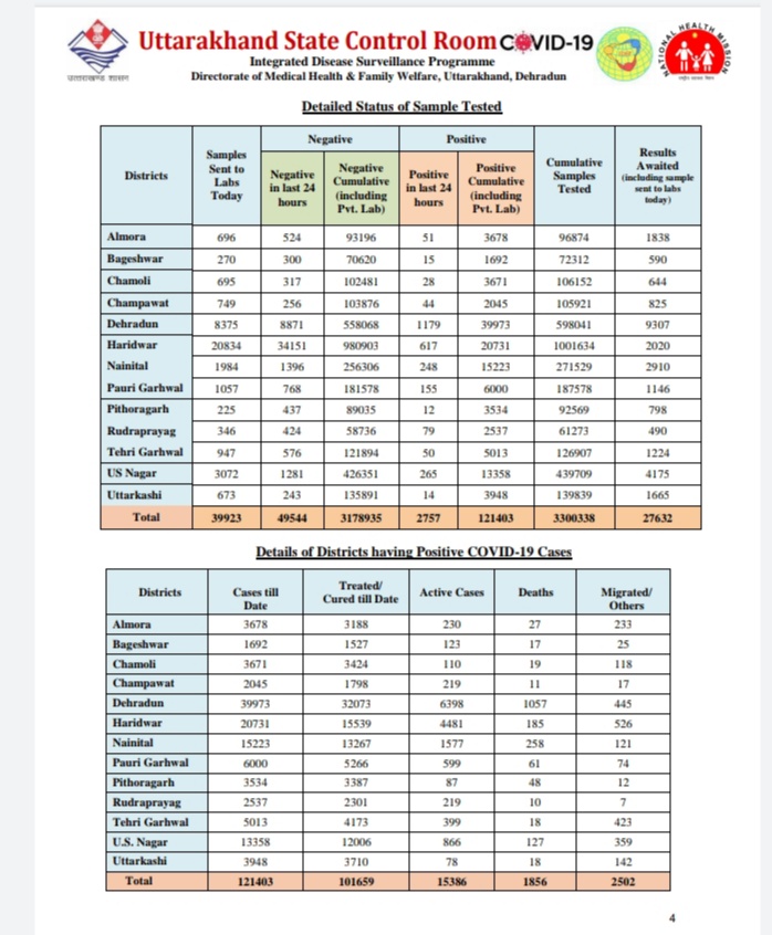 पिछले कुछ दिनों में सबसे अधिक 2757 के बाद हरिद्वार मे 568 और देहरादून में 1179 केस मिले। जनपद में नजर डालें तो 100 7777 सैंपल लैब भेजे गए। 98 42 85 की रिपोर्ट प्राप्त हुई 95 41 68 नेगेटिव जबकि 19 929 पॉजिटिव रिपोर्ट प्राप्त हुई ।शेष रिपोर्ट 23 332 आनी बाकी है। हरिद्वार जनपद में कुल एक्टिव केस की संख्या 1316 है ।पॉजिटिव व्यक्तियों की संख्या 19 92 9 है।