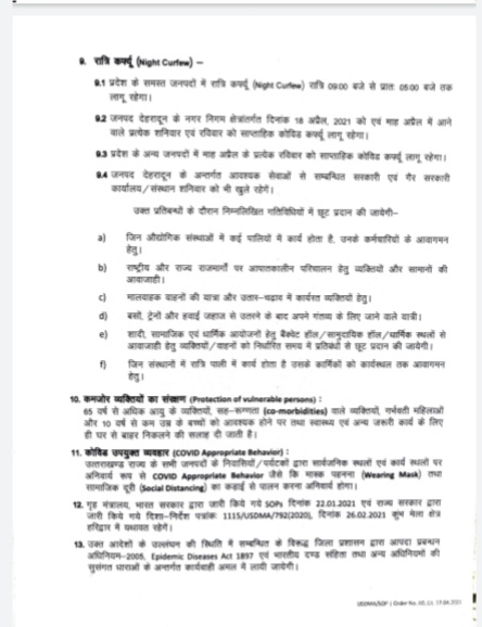 कोरोना संक्रमण की रोकथाम को लेकर राज्य सरकार द्वारा लगातार प्रयास प्रदेश के समस्त जनपदों में रात्रि कर्फ्यू 9:00 बजे से सुबह 5:00 बजे तक लगाया गया है। देहरादून में संक्रमण की रोकथाम को लेकर 18 अप्रैल से प्रत्येक शनिवार एवं रविवार को साप्ताहिक कोविड-19 कर्फ्यू लागू किया गया है। प्रदेश के अन्य जनपदों में रविवार को साप्ताहिक कोविड-19 कर्फ्यू लागू रहेगा ।