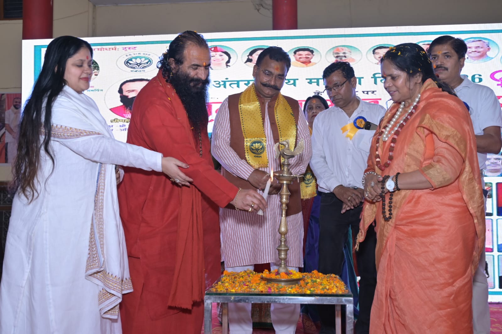 हरिद्वार, 8 मार्च। अंतर्राष्ट्रीय महिला दिवस के अवसर पर संकल्प संस्था परमो धर्म ट्रस्ट द्वारा श्री अवधूत मंडल आश्रम बाबा हीरादास मंदिर में सम्मान समारोह कार्यक्रम का आयोजन किया गया। समारोह मे विभिन्न क्षेत्र मे उत्कृष्ट प्रदर्शन करने वाली 20 महिलाओं को सम्मानित किया गया। सम्मान समारोह का शुभारंभ मुख्य अतिथि अखिल भारतीय अखाड़ा परिषद एवं मनसा देवी मंदिर ट्रस्ट के अध्यक्ष श्रीमहंत डा.रविंद्रपुरी महाराज, मेयर किरण जैसल, साध्वी प्राची एवं संकल्प सेवा परमो धर्म ट्रस्ट की अध्यक्ष रंजीता झा ने दीप प्रज्ज्वलित कर किया।