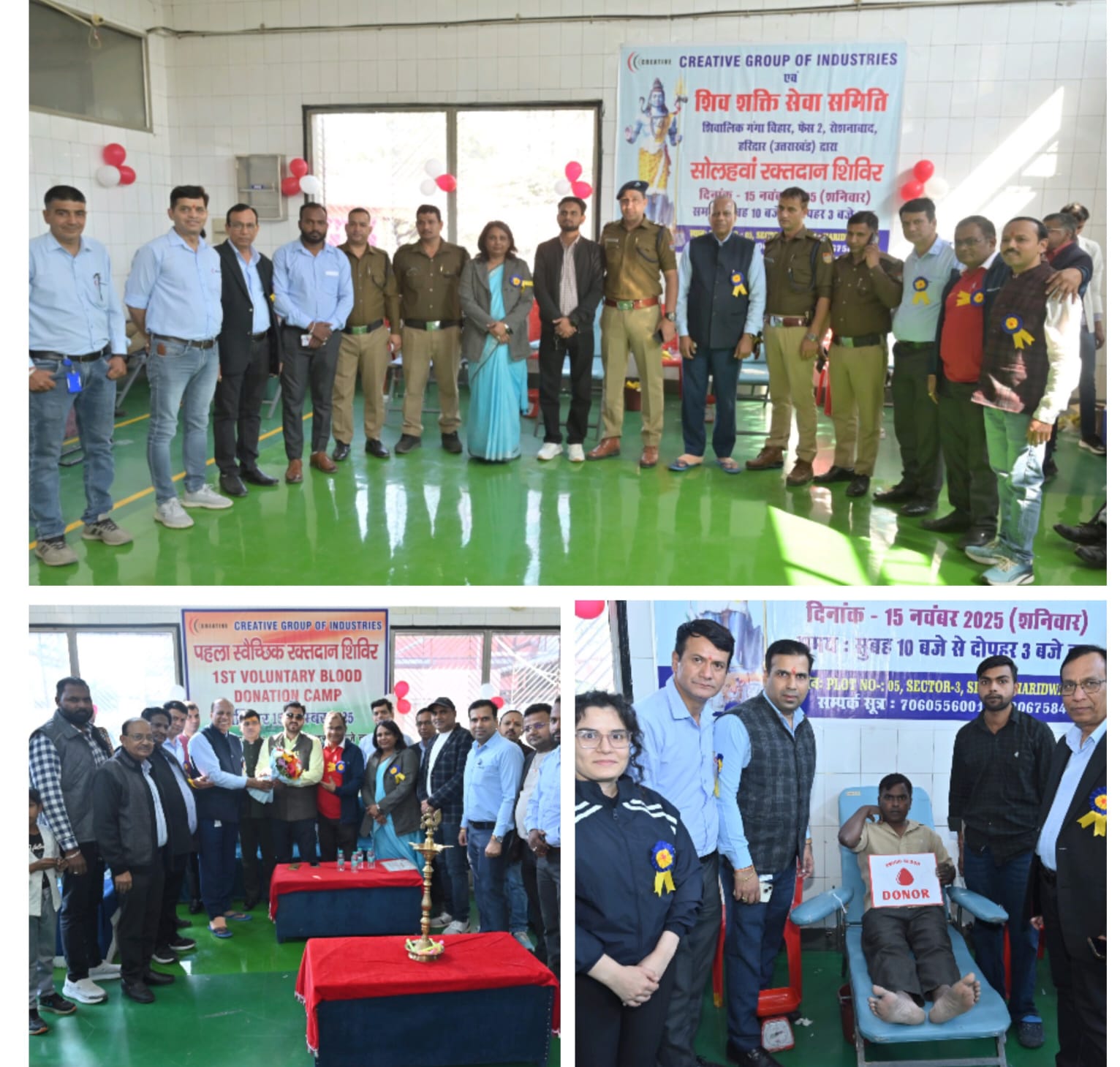 हरिद्वार। सिडकुल स्थित क्रिएटिव इंडस्ट्रीज व शिव शक्ति सेवा समिति द्वारा क्रिएटिव इंडस्ट्रीज सिडकुल में 16वां ब्लड डोनेशन कैंप लगाया गया। मां गंगा ब्लड बैंक व हिमालयन हॉस्पिटल जौलीग्रांट के सहयोग से आयोजित स्वैच्छिक रक्तदान शिविर में 451 रक्तदाताओं ने रक्तदान किया। रानीपुर विधायक आदेश चौहान ने दीप प्रज्वलित कर रक्तदान शिविर का शुभारंभ किया। विधायक आदेश चौहान ने कहा कि शिव शक्ति सेवा समिति पिछले 11 वर्षों से शिक्षा, चिकित्सा और समाज सेवा के क्षेत्र में बड़ा योगदान कर रही है। शिव शक्ति सेवा समिति द्वारा समय समय पर बड़े स्तर पर रक्तदान शिविर आयोजित कर समाज सेवा की जा रही है। शिवालिक नगर पालिका अध्यक्ष राजीव शर्मा ने कहा कि प्रत्येक व्यकित को रक्तदान करना चाहिए, रक्त दान महादान है। रक्तदान से जीवन बचता है। इस अवसर पर क्रिएटिव इंडस्ट्रीज के हेड राकेश त्यागी, समिति के अध्यक्ष देवेंद्र शर्मा, सदस्य राजेश पब्बन, ममता सैंगर, भोला सिंह, वीरेंद्र सिंह, नरेंद्र नेगी, पवन अग्रवाल, राजेश सैनी मौजूद रहे।