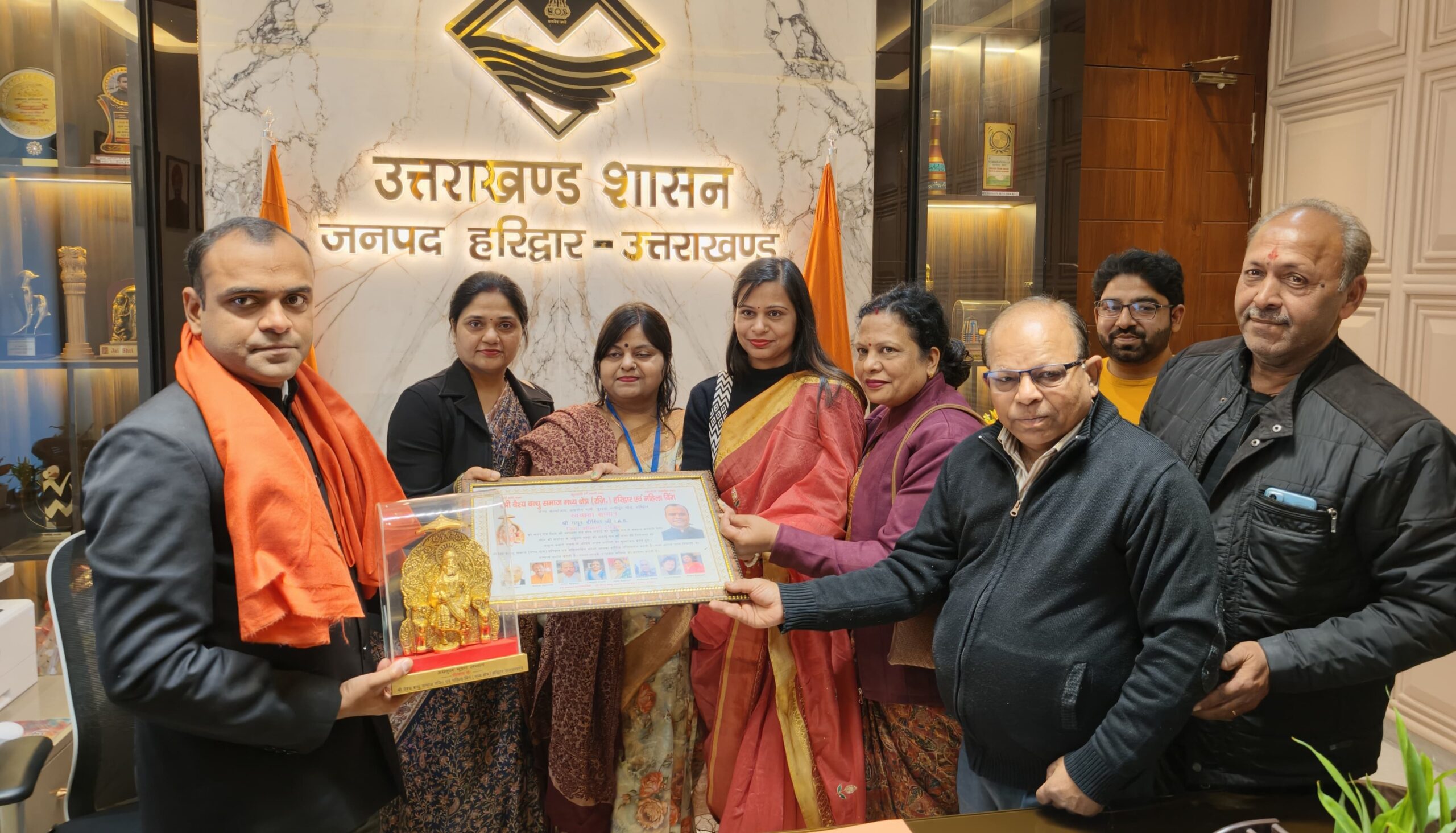 हरिद्वार, 18 जनवरी। श्री वैश्य बंधु समाज मध्य क्षेत्र एवं संस्था की महिला विंग ने धर्मनगरी को स्वच्छ सुंदर बनाने के लिए चलाए जा रहे जिला प्रशासन के अभियान की सराहना करते हुए जिलाधिकारी मयूर दीक्षित को सम्मान पत्र एवं महाराज अग्रसेन की प्रतिमा भेंटकर सम्मानित किया। इस दौरान श्री वैश्य बंधु समाज मध्य क्षेत्र हरिद्वार के संस्थापक अशोक अग्रवाल एवं अध्यक्ष विनीत अग्रवाल ने कहा कि जिलाधिकारी के निर्देशों जनपद में चलाए जा रहे स्वच्छता अभियान से आम लोग भी साफ सफाई के प्रति जागरूक होकर अभियान से जुड़ रहे हैं।