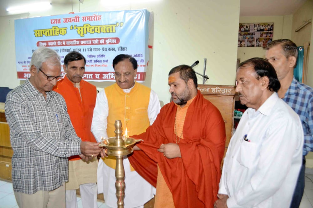 हरिद्वार, 7 नवम्बर। हरिद्वार के सर्वाधिक लोकप्रिय साप्ताहिक समाचार पत्र सृष्टि वक्ता का रजत जयंती समारोह प्रेस क्लब सभागार में आयोजित किया गया। इस अवसर पर बदलते दौर में साप्ताहिक समाचाार पत्रों की भूमिका विषय पर आयोजित विचार गोष्ठी का मुख्य अतिथी पूर्व केंद्रीय मंत्री एवं हरिद्वार सांसद डा.रमेश पोखरियाल निशंक, महामंडलेश्वर स्वामी रामेश्वरानंद सरस्वती महाराज, विशिष्ट अतिथी मेयर अनिता शर्मा, साप्ताहिक सृष्टि वक्ता के संपादक विक्रम छाछर, प्रेस क्लब अध्यक्ष श्रवण झा, महामंत्री अश्विनी अरोड़ा ने दीप प्रज्वलित कर शुभारंभ किया। कार्यक्रम का संचालन वरिष्ठ पत्रकार रजनीकांत शुक्ला एवं शिवांग अग्रवाल ने किया।