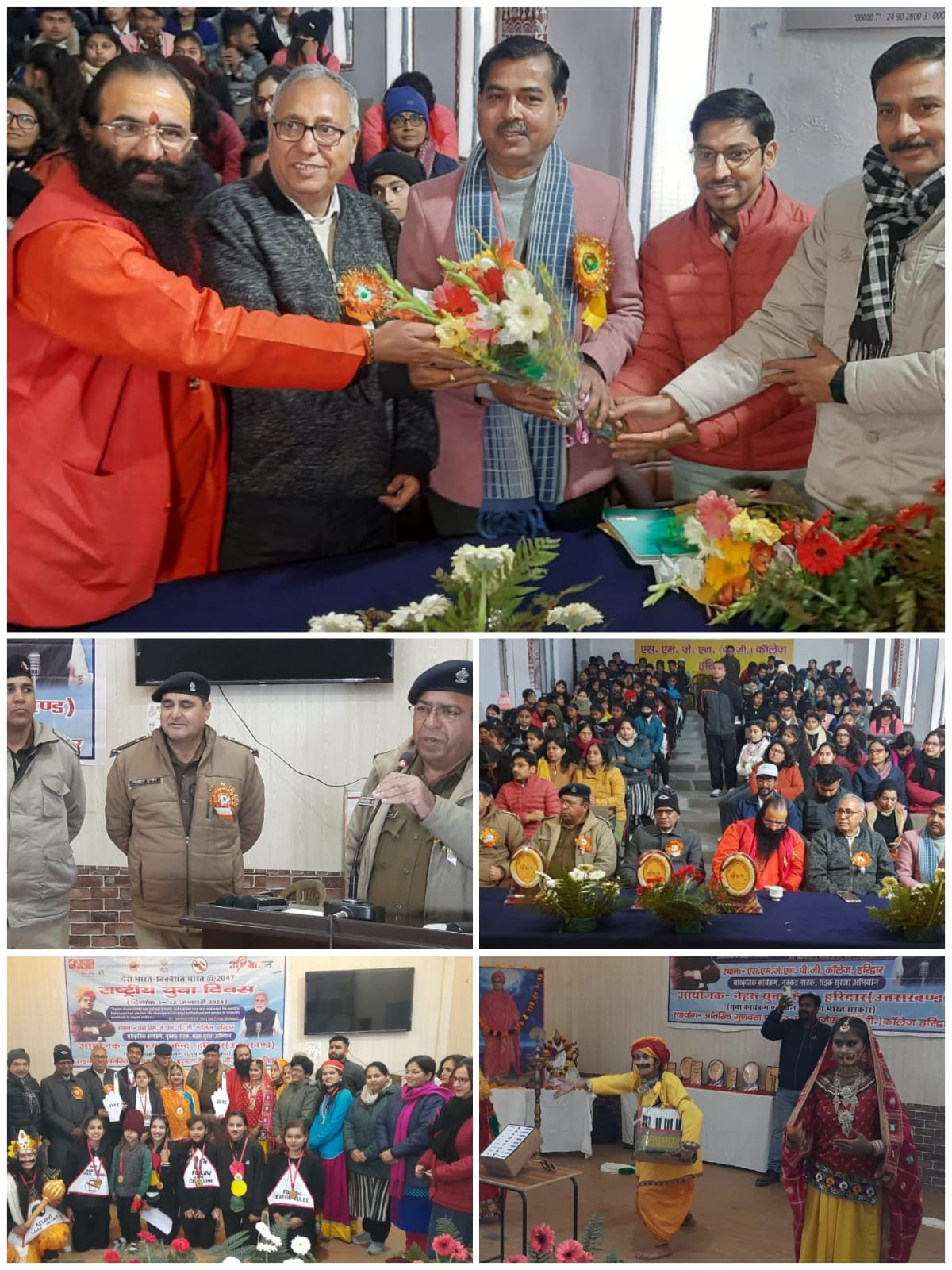 हरिद्वार, 12 जनवरी। युवा दिवस के अवसर पर एसएमजेएन कालेज के सभागार में नेहरू युवा केंद्र एवं एसएमजेएन कालेज के संयुक्त तत्वावधान में आयोजित स्वामी विवेकानंद के जयंती पर सांस्कृतिक कार्यक्रम, सड़क सुरक्षा सप्ताह तथा स्वामी विवेकानंद के विचारों का स्मरण एवं मचंन किया गया। कार्यक्रम का शुभारंभ अखाड़ा परिषद एवं कालेज प्रबंध समिति के अध्यक्ष श्रीमहंत रविन्द्रपुरी, रानीपुर विधायक आदेश चौहान, कालेज के पूर्व प्राचार्य डा.शिवशंकर जायसवाल, प्राचार्य डा.सुनील कुमार बत्रा, सीओ ट्रैफिक राकेश रावत, ट्रैफिक इंसपेक्टर विकास पुण्डींर, नेहरू युवा केन्द्र के धर्म सिंह रावत ने दीप प्रज्वलन, मां सरस्वती की वंदना, पुष्पांजलि एवं स्वामी विवेकानंद के चित्र पर पुष्प अर्पित कर किया। महाविद्यालय की और से सभी अतिथीयों को स्मृति चिन्ह एवं बुके देकर स्वागत किया गया।