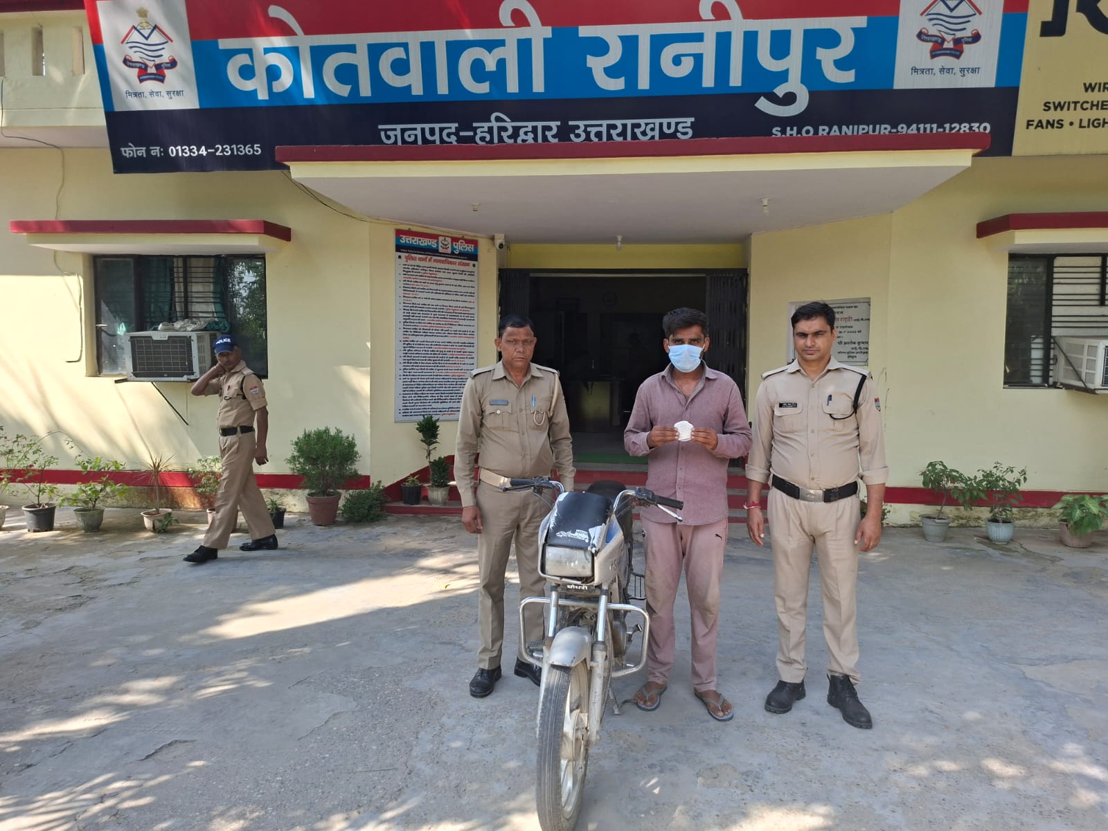 हरिद्वार, 13 अक्तूबर। कोतवाली रानीपुर पुलिस ने बाइक से स्मैक तस्करी कर रहे एक आरोपी को गिरफ्तार किया है। पुलिस ने आरोपी के कब्जे से 30 हजार रूपए कीमत की 6.55 ग्राम स्मैक बरामद की है। स्मैक तस्करी में प्रयुक्त बाइक को पुलिस ने सीज कर दिया है। नशा तस्करों के खिलाफ चलाए जा रहे अभियान के क्रम में रानीपुर कोतवाली सुमन नगर सलेमपुर तिराहा के पास चेकिंग के दौरान संदिग्ध लगने पर एक मोटर साइकिल सवार को रोककर तलाशी ली तो उसके कब्जे से स्मैक बरामद हुई।