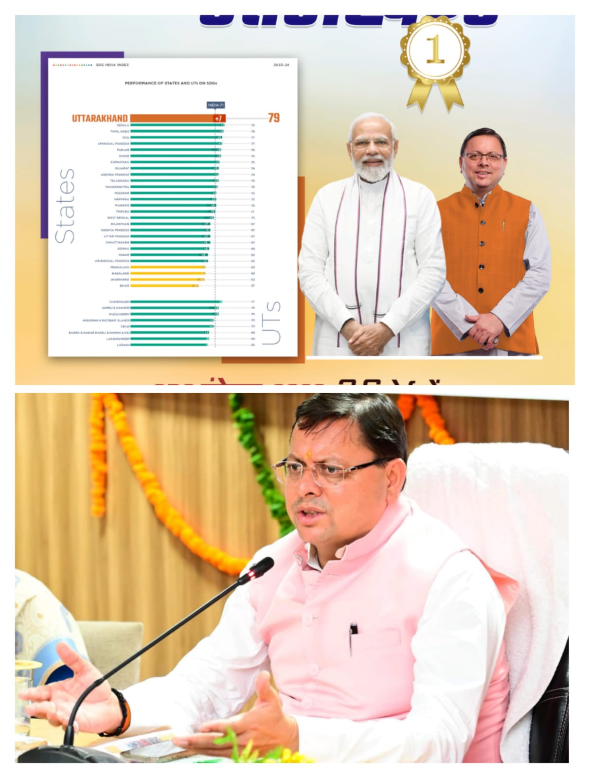 सभी प्रदेशवासियों को बधाई देते हुए मुख्यमंत्री पुष्कर सिंह धामी ने कहा कि प्रदेश की देवतुल्य जनता के आशीर्वाद और सहयोग से ये उपलब्धि हासिल हुई है। प्रधानमंत्री श्री नरेंद्र मोदी जी के कुशल नेतृत्व में हमारी डबल इंजन सरकार के विकासोन्मुखी प्रयासों से आज हमारा प्रदेश अग्रणी राज्य बनने की दिशा में आगे बढ़ा है। नीति आयोग द्वारा जारी सतत विकास लक्ष्य (SDG INDEX) 2023-2024 की रिपोर्ट में उत्तराखण्ड का शीर्ष स्थान प्राप्त करना इसका प्रत्यक्ष प्रमाण है। राज्य सरकार में केबिनेट के सहयोगियों, शासन प्रशासन के अधिकारियों को भी बहुत बधाई।