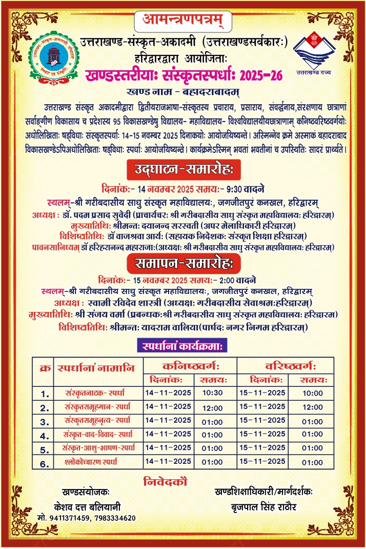 बहादराबाद खंड शिक्षाधिकारी बृजपाल सिंह राठौर के मार्गदर्शन में श्री गरीबदासीय साधु संस्कृत महाविद्यालय जगजीतपुर कनखल में 14 नवम्बर को बहादराबाद खंड की कनिष्ठ वर्ग कक्षा 6-से लेकर 10 तक एवं 15 नवम्बर को वरिष्ठ वर्ग कक्षा 11 से लेकर स्नातकोत्तर की प्रतियोंिगता का आयोजन किया जाएगा।