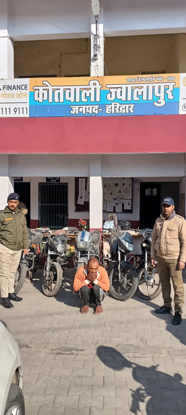 हरिद्वार, 22 दिसम्बर। ज्वालापुर कोतवाली पुलिस ने शातिर वाहन चोर को गिरफ्तार किया है। सीसीटीवी कैमरे की मदद से पकड़ में आए आरोपी की निशानदेही पर पुलिस ने अलग अलग जगह से चोरी की गयी पांच बाईक बरामद की हैं। कोतवाली पुलिस के अनुसार बीती 19 दिसम्बर को बाईक चोरी के एक मामले की जांच पड़ताल के दौरान घटनास्थल के आसपास लगे सीसीटीवी फुटेज को चेक करने पर सैफुद्दीन उर्फ बबलू निवासी ़छोटी इक्कड खुर्द थाना पथरी को चोरी की बाइक के साथ गिरफ्तार किया गया। आरोपी की निशानदेही पर उसके कब्जे से चोरी की चार अन्य बाईक बरामद की गयी। पुलिस टीम में एसआई इंद्रजीत राणा, कांस्टेबल वीरेंद्र चैहान व नरेंद्र राणा शामिल रहे।