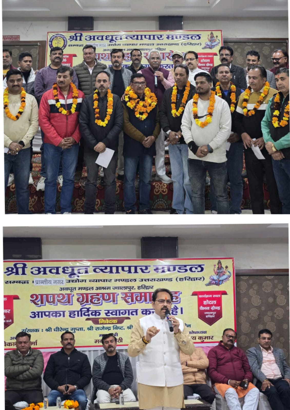 हरिद्वार, 7 दिसम्बर। प्रांतीय नगर उद्योग व्यापार मंडल से संबद्ध श्री अवधूत व्यापार मंडल की कार्यकारिणी का शपथ ग्रहण समारोह ज्वालापुर मार्ग स्थित होटल में आयोजित किया गया। नगर विधायक मदन कौशिक एवं प्रांतीय नगर उद्योग व्यापार मंडल के जिला अध्यक्ष डा.विशाल गर्ग ने संयुक्त रूप से व्यापार मंडल के नवनियुक्त पदाधिकारियों अध्यक्ष रविकांत शर्मा, महामंत्री मनीष सेठी, कोषाध्यक्ष विनय कुमार एवं राजेंद्र सिंह, उपाध्यक्ष सनी, हेमंत चावला, सचिन मलिक, मंत्री मनीष चौहान, प्रदीप चौहान व नरेंद्र चौहान, मीडिया प्रभारी अंकित प्रजापति, कार्यालय प्रभारी पुष्पेंद्र सिंह, प्रचार मंत्री शिवकुमार, संगठन मंत्री ललित ममगइ सहित कार्यकारिणी को शपथ दिलाई।