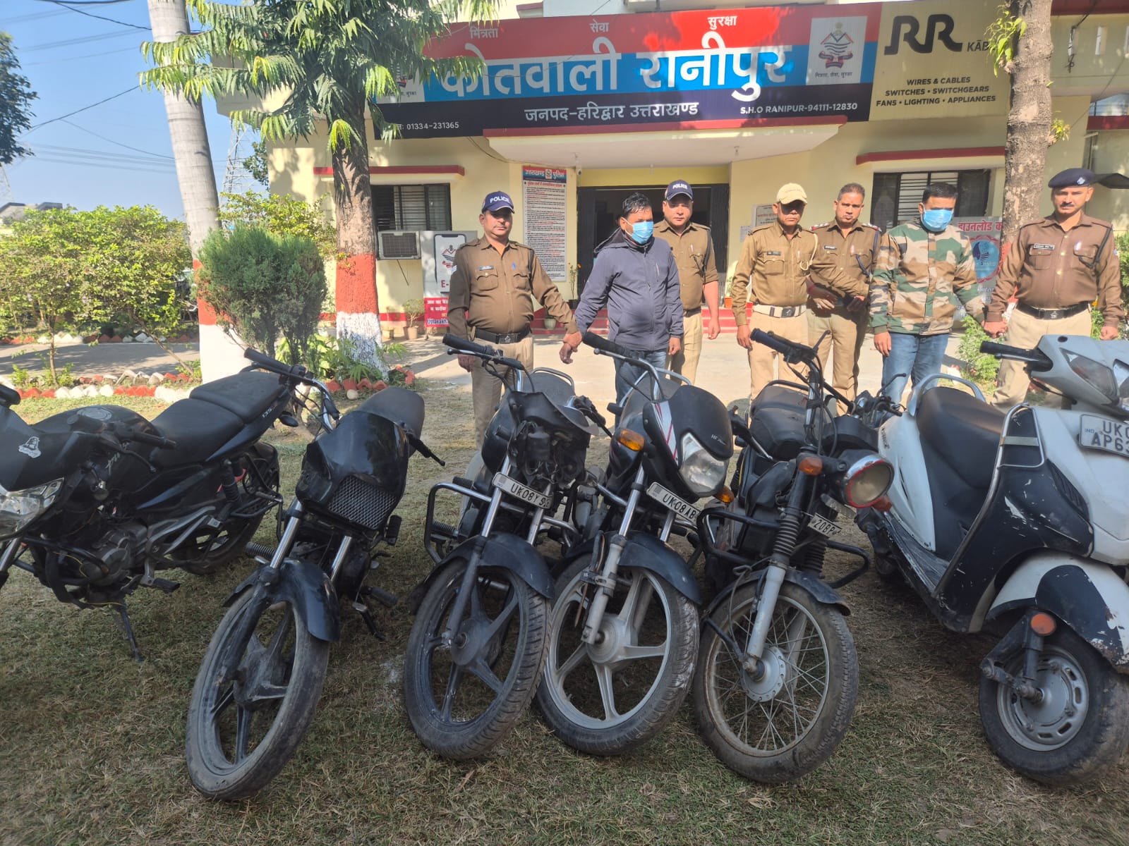 हरिद्वार, 24 नवम्बर। कोतवाली रानीपुर पुलिस और सीआईयू टीम ने दोपहिया वाहन चोर गिरोह के दो सदस्यों को गिरफ्तार कर हरिद्वार के अलग-अलग इलाकों से चोरी की गयी 10 बाइक बरामद की हैं। गिरोह मास्टर चाभी लगाकर बाइक चोरी की घटनाओं को अंजाम देता था। चोरी किए गए दोपहिया वाहन को मुरादाबाद के रास्ते नेपाल ले जाकर मोटे मुनाफे पर बेचे दिए जाते थे।